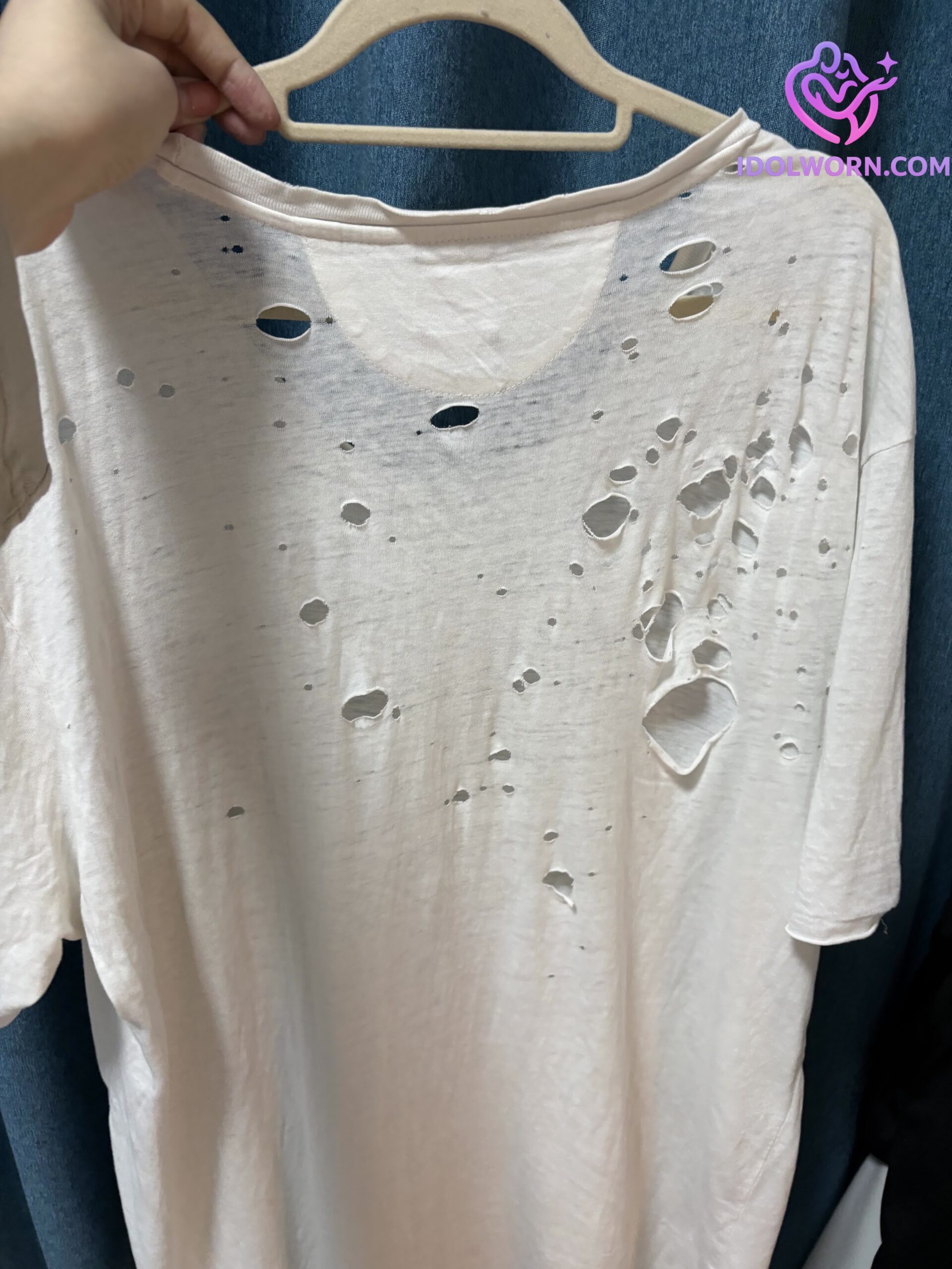 This was on my back through every sweat-soaked rehearsal, every high-energy performance, every moment I poured everything into singing for you.The faint marks on the fabric? From the water I splashed on my face mid-show, the way the lights hit my skin, the energy of the crowd seeping into every thread. This isn’t just a t-shirt.It’s the skin I wore when I was closest to being fully alive.Now it’s yours to keep—every stain, every soft fold, every piece of the night we shared.